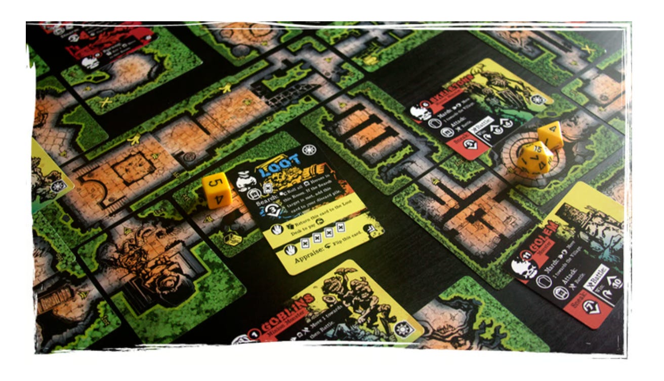 The Dungenerator: DIE in the Dungeon project looks AWESOME. Nice artwork, and the gameplay sounds really fun. From the Kickstarter: DIE in a Dungeon is a solo or 2-player-cooperative, narrative dungeon-crawler. In it, your polyhedral dice (the same ones you use for popular tabletop RPGs) become doomed adventurers attempting to save and rebuild a village that sits on the edge of a labyrinthine, ever-shifting dungeon!