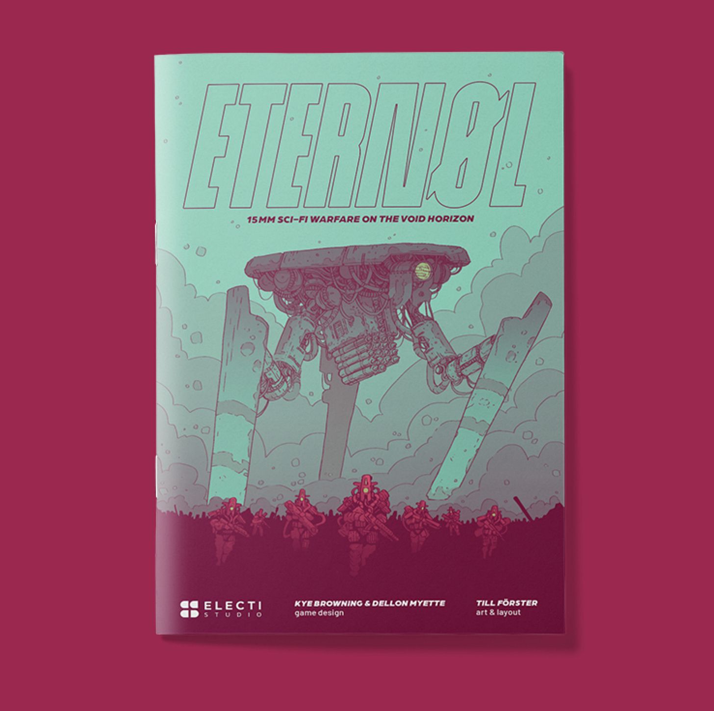 From the email: Eternøl (pronounced ee-tur-null) is an easy-to-pick-up, fully customizable, miniature-agnostic tabletop war game at half scale, designed for 15mm miniatures. Players build and paint their armies to defeat opponents, using ten-sided dice, tokens, and various terrain types on a play area, with the game rules and vibrant graphic design presented in a magazine format.